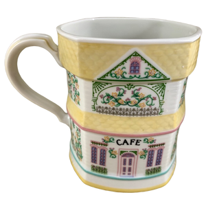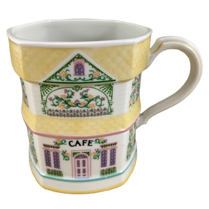 This mug is shaped like a building with "CAFE" printed on its lower surface on the front and rear.