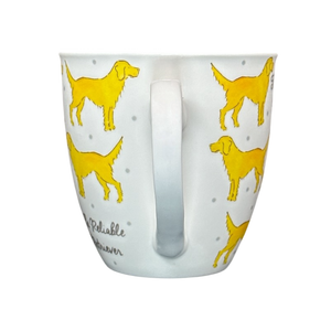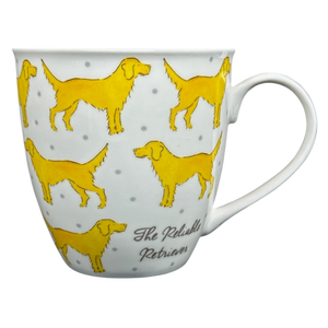 There are also gray polka dots wrapping around the exterior surface in between the images of the retrievers.