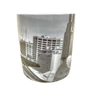 Features artwork wrapping around its exterior surface depicting a city skyline and an airplane.