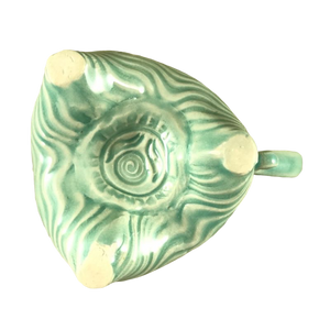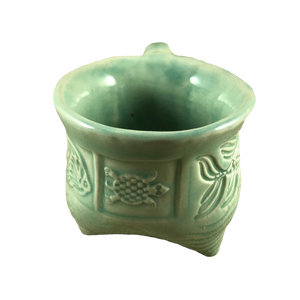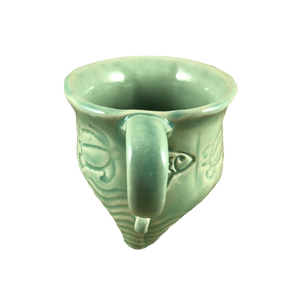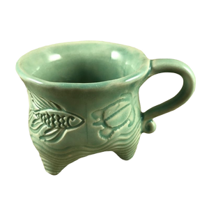 This mug has a hand made appearance and features etched fish and turtles encircling its exterior.