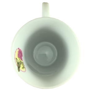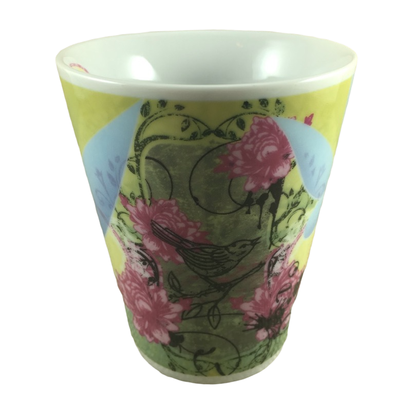 On the inside on the rear upper surface is an image of a bird sitting on a branch next to a pink flower.