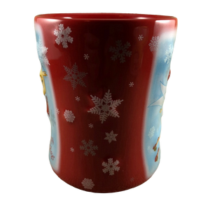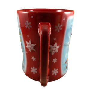 Also features embossed snowflakes scattered around the red areas of the exterior surface and a fancy sculpted handle.