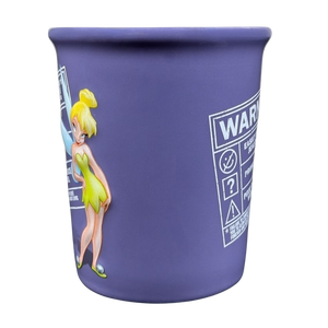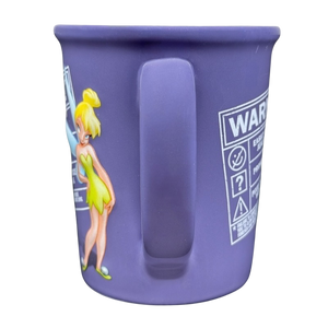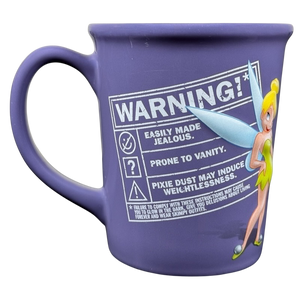 This mug displays identical artwork on both the front and back, featuring Tinker Bell embossed alongside a "WARNING!" sign. The sign cautions: "EASILY MADE JEALOUS" at the top, followed by "PRONE TO VANITY," and concludes with "PIXIE DUST MAY INDUCE WEIGHTLESSNESS," capturing her whimsical charm with elegance.