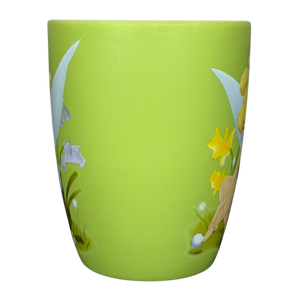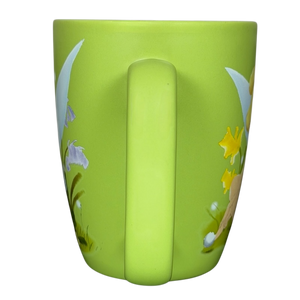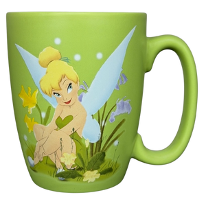 This charming Disney Store exclusive mug features Tinker Bell in a delicate, colorful illustration set against a soft green background with floral accents and her signature wings extending across the design. The gently tapered shape, smooth matte-like exterior, and glossy green interior create a clean, comfortable feel, complemented by a sturdy handle for everyday use. The bottom is marked with Disney Store Exclusive and Disney Fairies branding, and notes it is microwave and dishwasher safe, making it a collectible yet practical piece for fans of Tinker Bell and classic Disney magic.
