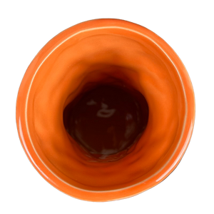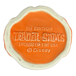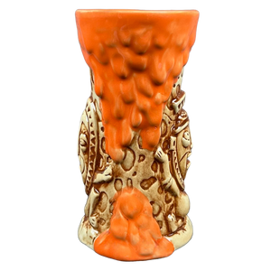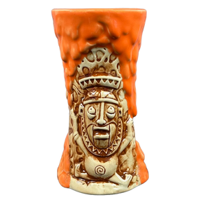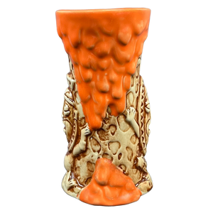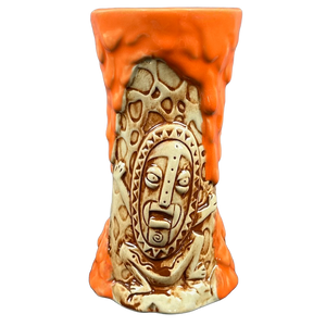 There is orange lava overflowing from the top of the mug down and around the tiki figures.