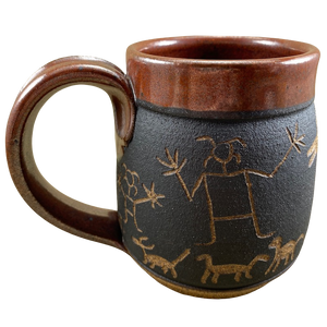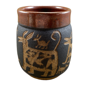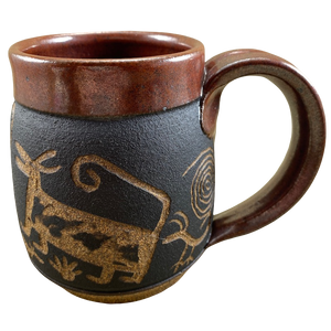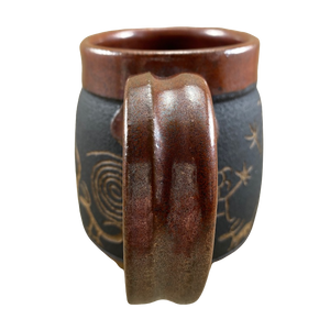 It features etched artwork wrapping around its exterior surface depicting many different tribal images.