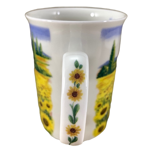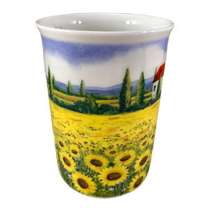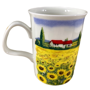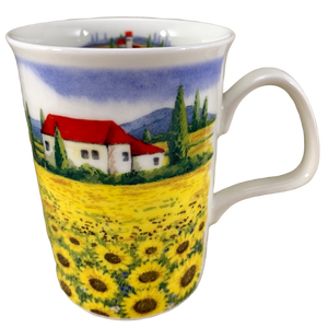 Features a beautiful field filled with sunflowers and houses with a red roof in the background wrapping around its exterior surface.