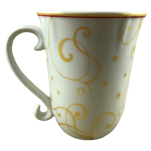 Also features gold and red trim wrapping around just under the rim and a fancy scroll handle.