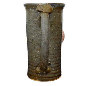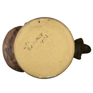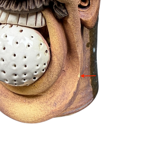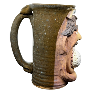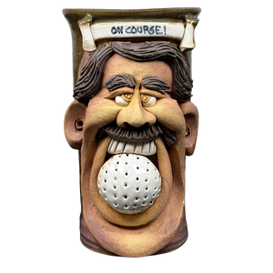 This Vintage Studio Art Pottery Mug is a unique find for any golf enthusiast, featuring a whimsical "ugly face" design with a dimensional golf ball caught in the character's open mouth. Handcrafted with a textured, earth-toned glaze, the mug showcases expressive sculpted details including a prominent mustache, wide eyes, and a scroll banner at the top that playfully reads "On Course!" The base features an incised signature and date that appears to potentially read 1992, though both the artist and the exact year remain uncertain due to the stylized and difficult to read nature of the script. Standing as both a functional coffee cup and a conversation-starting collectible, this stoneware piece is finished with a sturdy, ergonomic handle and a ribbed body that highlights its artisanal origins.