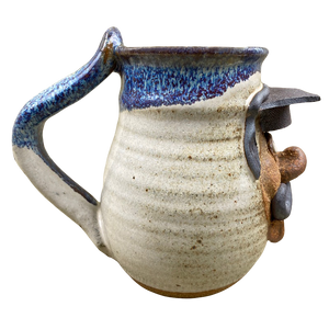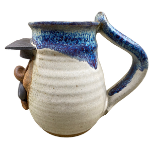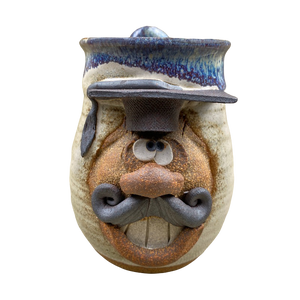 This is a pottery style ugly face mug with a graduation hat and tassel.