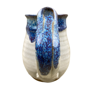 There is a beautiful blend of blues that is hard to describe which wraps around the upper surface, the rim, the inner upper surface, and on much of the front and rear of the handle , please see the photos.