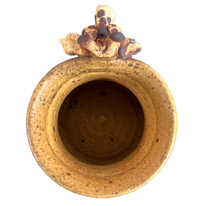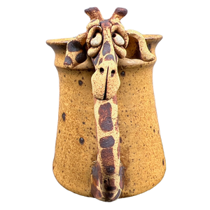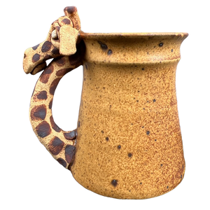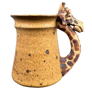This is an ugly face handmade pottery style mug with a handle shaped like a giraffe's head and neck.