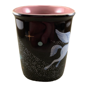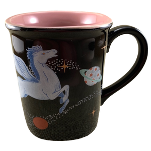 Features a beautiful blue unicorn in space with stars and planets surrounding it.