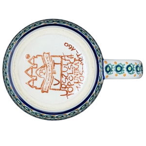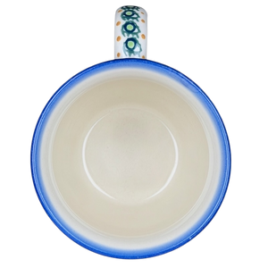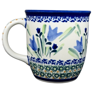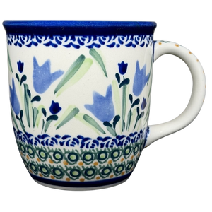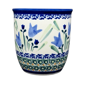 This authentic Unikat Polish pottery mug features a graceful, flared rim and a beautifully hand-painted scene of vibrant blue bell flowers reaching upward amidst soft green leaves. The artisanal design is bordered by intricate geometric patterns of cobalt blue, sage green, and honey-toned accents that wrap around the base and top edge. A sturdy handle decorated with matching circular motifs provides a comfortable grip, while the interior is finished with a smooth, cream-colored glaze for a classic look. Handcrafted in Poland and signed by artist Urszula Topolska, this durable stoneware piece is both microwave and dishwasher safe, offering a unique blend of traditional folk art and practical everyday elegance.