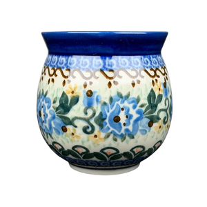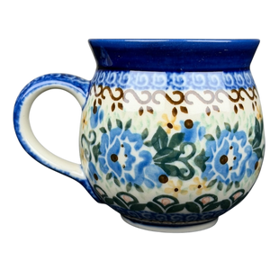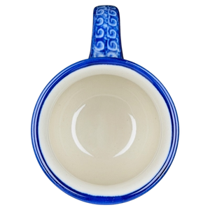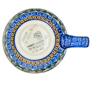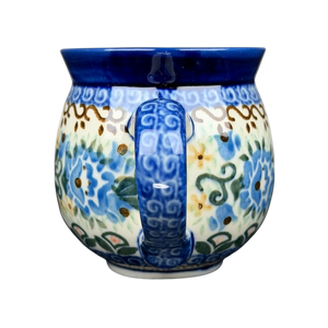 This authentic Unikat Polish pottery mug features a beautifully rounded silhouette adorned with a vibrant, hand-painted floral pattern of sapphire blue blossoms and lush green leaves. A deep cobalt blue rim provides a bold frame for the piece, while intricate brown scrollwork and delicate yellow accent flowers add layers of artisanal detail across the cream-colored stoneware. The sturdy handle is decorated with matching blue patterns, leading to a smooth, light cream interior that offers a clean contrast to the highly detailed exterior. Handcrafted in Poland by artist A. Fryc, this durable and high-quality mug is both microwave and dishwasher safe, making it a perfect blend of traditional folk art and modern functional kitchenware.
