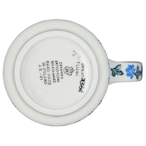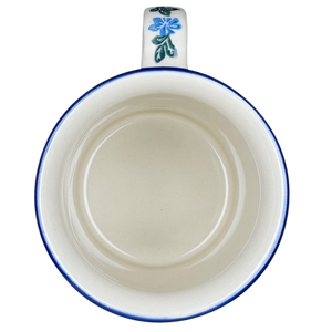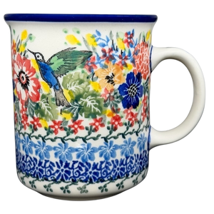 This authentic Boleslawiec Polish pottery mug showcases a vibrant, hand-painted scene featuring a detailed hummingbird in mid-flight surrounded by a lush garden of coral, blue, and yellow blossoms. The intricate design is layered with green botanical accents and decorative geometric borders in cobalt blue that wrap around the base and rim. A sturdy handle adorned with matching blue floral motifs complements the classic cylindrical shape, while the smooth, creamy white interior provides a clean contrast to the highly detailed exterior artistry. Handcrafted in Poland by artist T Liana, this durable stoneware piece is both microwave and dishwasher safe, offering a perfect blend of traditional folk art and functional everyday use.