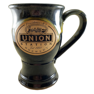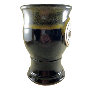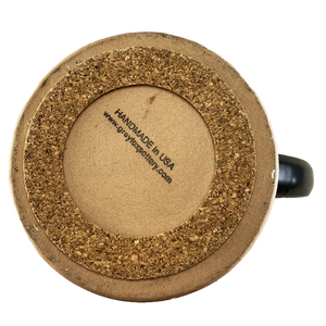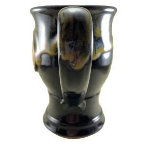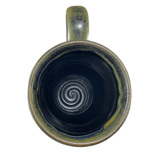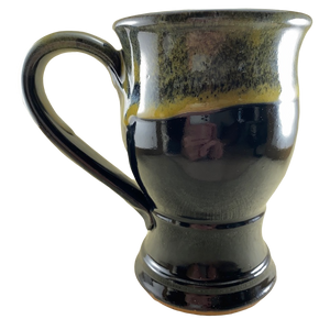 This is a beautiful hand thrown mug that has a gorgeous finish in several shades of green with a bit of yellow and orange mixed in on its upper 1/3. The lower 2/3 are finished in solid black.