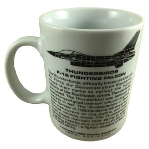 On the back surface is an illustration of the F-16 Fighting Falcon jet with a informational paragraph about this jet below it.
