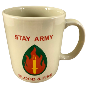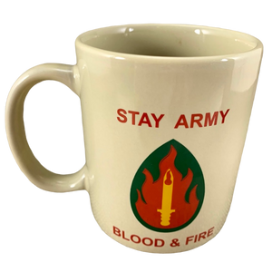 Above the symbol is printed "STAY ARMY" and below the symbol is printed "BLOOD & FIRE"