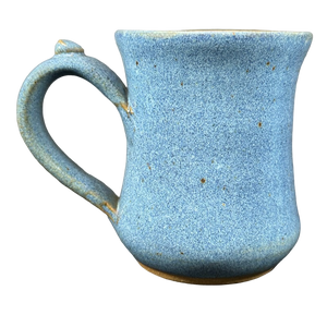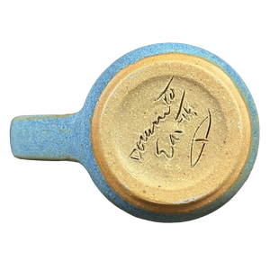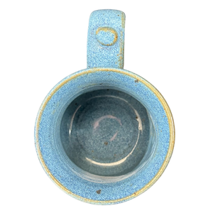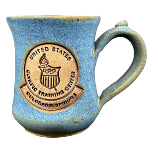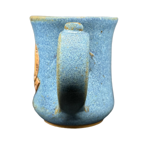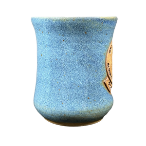 This vintage pottery mug features a raised plaque on its front surface with the following etched into it: