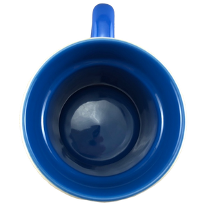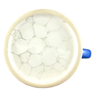 The exterior has a white marbled finish with a solid blue finish on its interior and handle.
