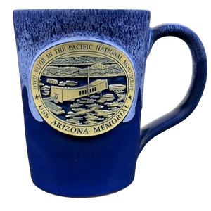 This handcrafted mug showcases a raised plaque on its front, illustrating the USS Arizona Memorial. Above the plaque, the inscription reads "WWII VALOR IN THE PACIFIC NATIONAL MONUMENT," while below, it is engraved with "USS ARIZONA MEMORIAL."