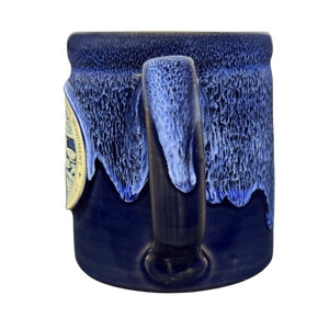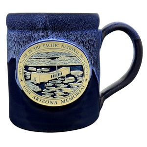 This handcrafted mug showcases a raised plaque on its front, illustrating the USS Arizona Memorial. Above the plaque, the inscription reads "WWII VALOR IN THE PACIFIC NATIONAL MONUMENT," while below, it is engraved with "USS ARIZONA MEMORIAL."