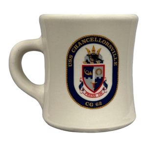 This mug features the USS Chancellorsville insignia on its rear surface.