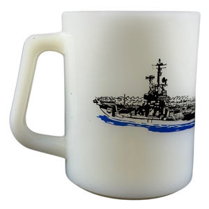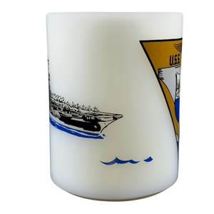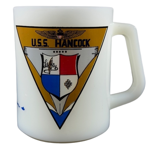 This mug displays the USS Hancock emblem prominently on the front. The reverse side showcases a detailed image of the USS Hancock, an Essex-class aircraft carrier of the United States Navy, commissioned on April 15, 1944.