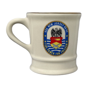 This mug features the USS New Jersey insignia on its rear surface.