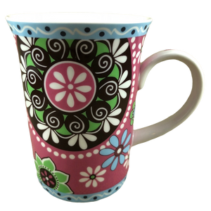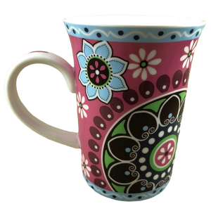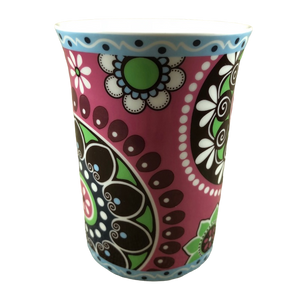 Features floral artwork wrapping around its exterior surface.