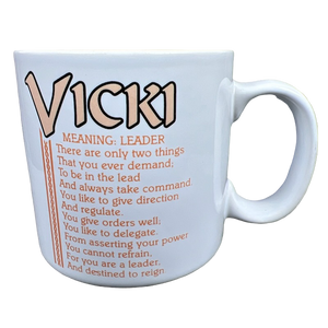 Features the name Vicki printed in a large font at the top of the front side of the mug. Directly underneath this is a poem about the name Vicki.