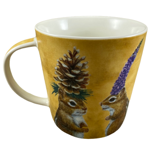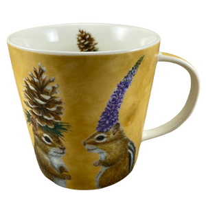 Features the same artwork on the front and rear surface and handle depicting 2 chipmunks wearing hats. One hat is a pinecone, the other is some sort of foliage.
