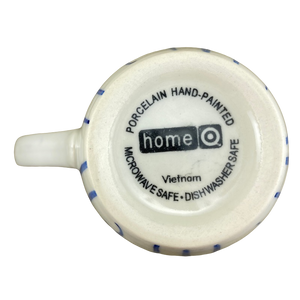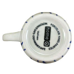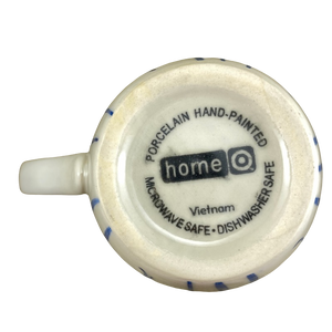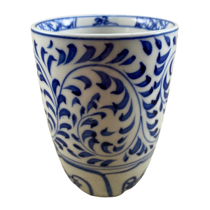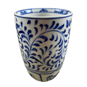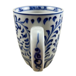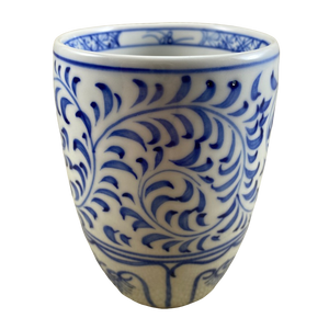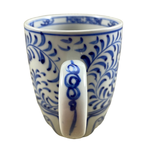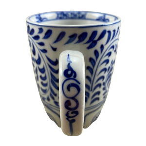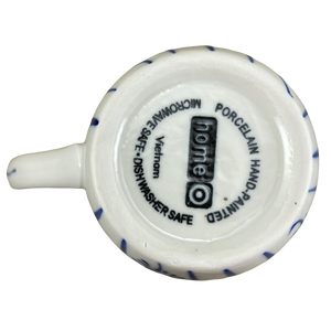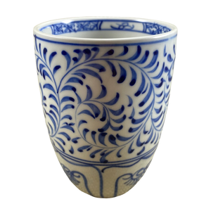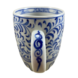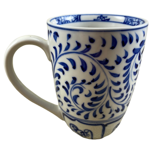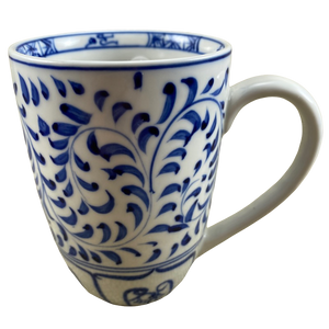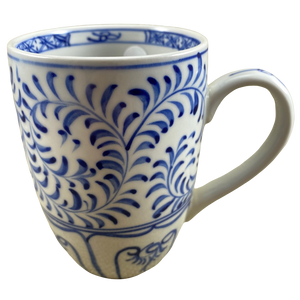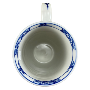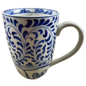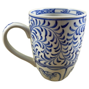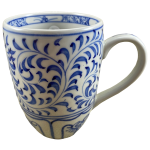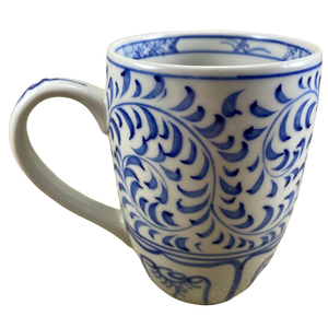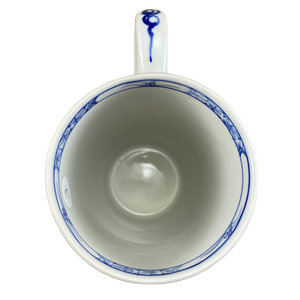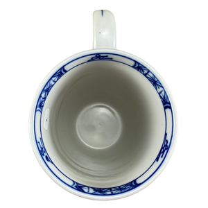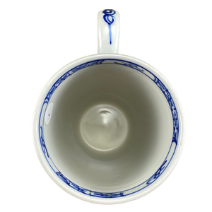 This rare mug features a beautiful blue and white abstract pattern which wraps around its exterior surface and on the handle.