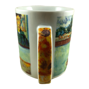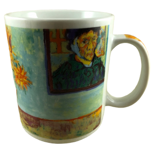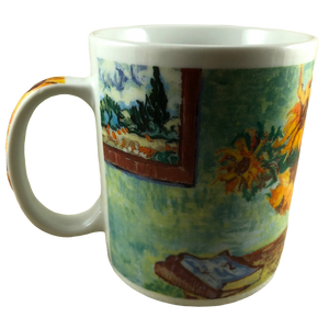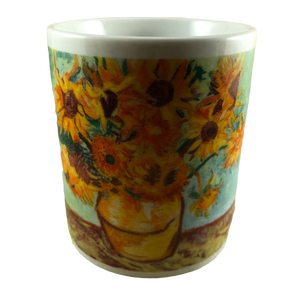Artwork wrapping around the exterior surface depicts a scene with sunflowers in a vase on a table, books on the table and 2 pieces of framed art hanging on the wall in the background.