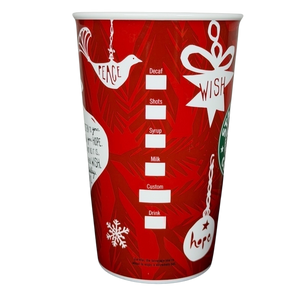 This festive Starbucks tall mug captures the warmth of the holiday season with its vibrant red background, white ornament illustrations, and soft pine-needle pattern woven throughout the design. The front features the classic green Starbucks logo, while the rest of the mug is wrapped with cheerful winter motifs like mittens, stars, snowflakes, and hopeful messages such as “wish,” “love,” and “hope.” One side displays an inspirational holiday message, and the other mimics a classic Starbucks drink label for a fun, nostalgic touch. With its sleek tapered shape and bright seasonal artwork, this mug brings holiday cheer to every sip.