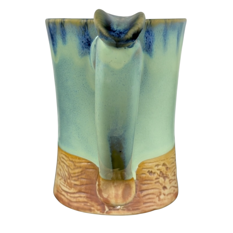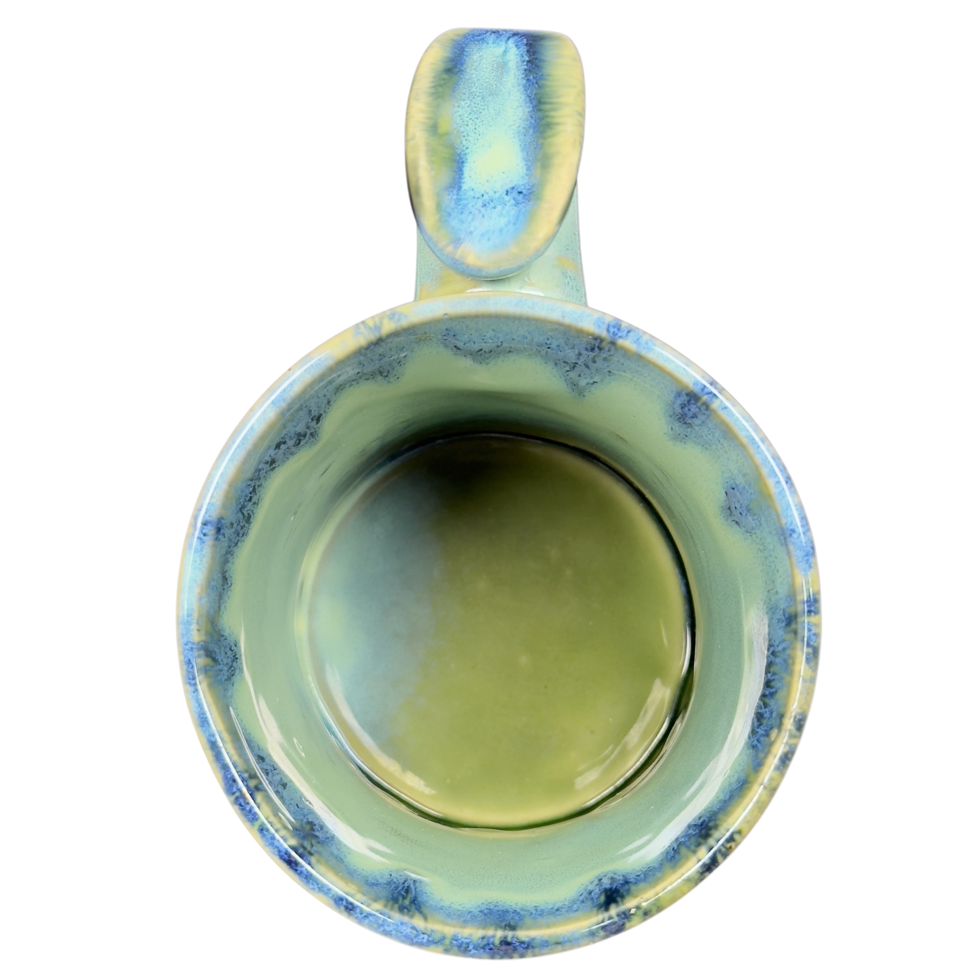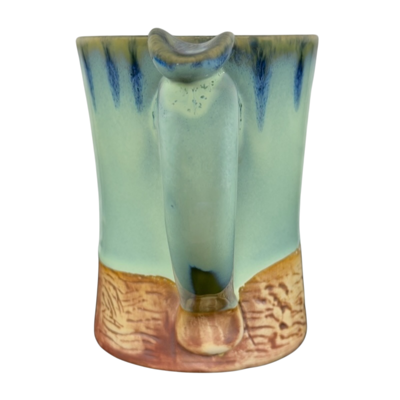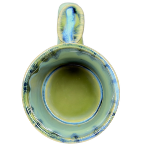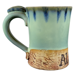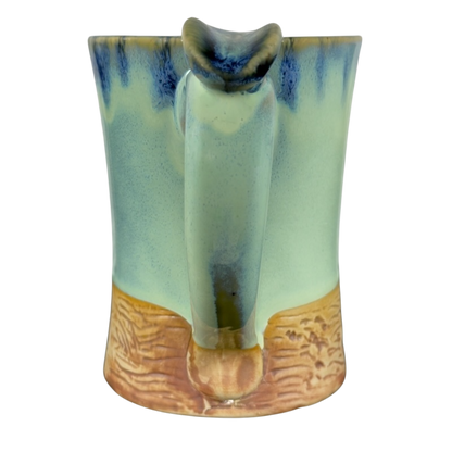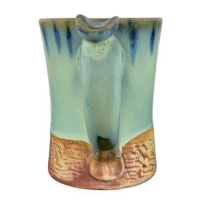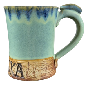 This glorious large pottery mug features an aqua blue glaze with green and royal blue accents.