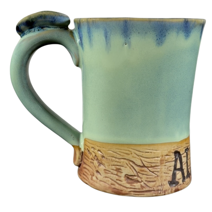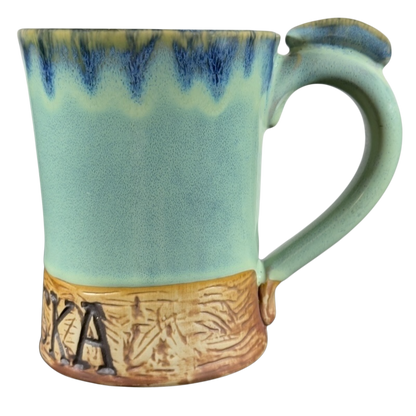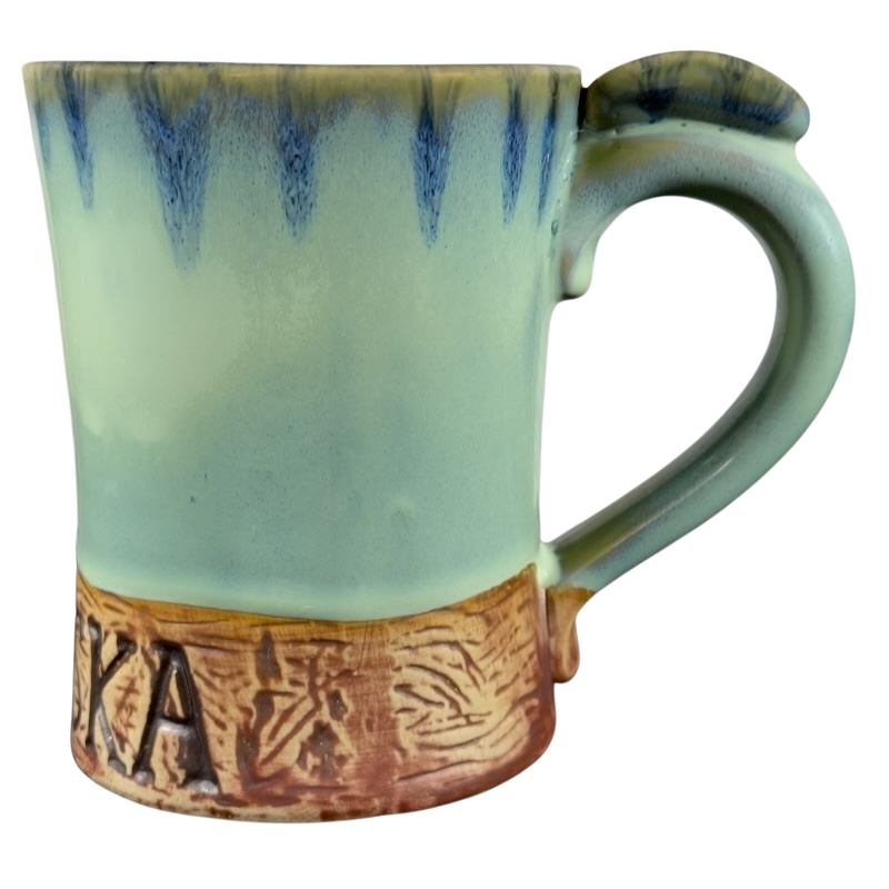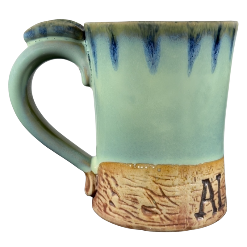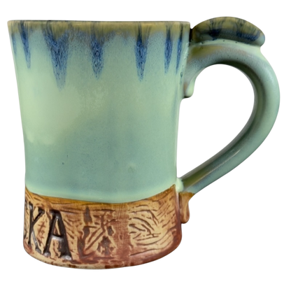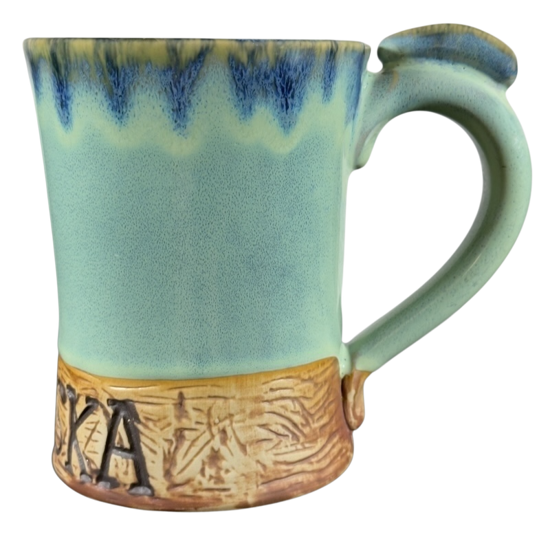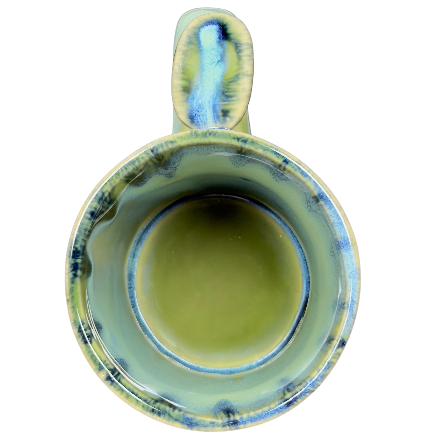This glorious large pottery mug features an aqua blue glaze with green and royal blue accents.
