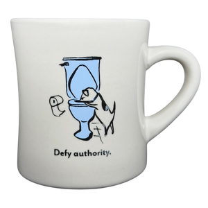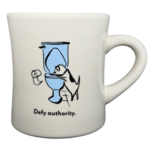 This humorous ceramic mug features a playful illustrated dog mischievously reaching into a blue toilet bowl, paired with the cheeky phrase “Defy authority.” for a classic dose of Bad Dog Wisdom. The minimalist black line art and soft blue accent stand out against the clean white exterior, while a small “Bad Dog Wisdom” emblem on the opposite side adds a subtle branded touch. Finished with a smooth white interior, comfortable curved handle, and gently tapered shape, this mug combines lighthearted rebellion and everyday practicality, making it a fun conversation piece for coffee or tea.
