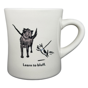 This playful ceramic mug features a minimalist black line illustration of two dogs paired with the witty phrase “Learn to bluff.” capturing a clever moment of canine wisdom with a humorous twist. The clean white exterior keeps the artwork crisp and modern, while a small “Bad Dog Wisdom” emblem on the opposite side adds a subtle branded accent. Finished with a smooth white interior, a comfortable curved handle, and a gently flared shape, this mug combines understated humor and everyday functionality, making it a fun choice for dog lovers or anyone who enjoys a smart, lighthearted coffee companion.