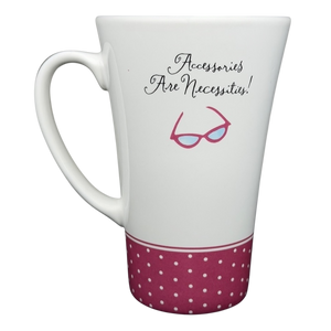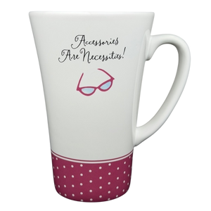 Celebrate timeless style with this charming Hallmark Barbie 45th Anniversary mug, a playful tribute to fashion lovers and collectors alike. The design features a crisp white backdrop accented by a deep pink polka-dot band along the lower half, giving the mug a retro-inspired look that feels both fun and sophisticated. Front and center is a pair of chic, stylized eyeglasses in bright pink and blue, paired with the whimsical phrase “Accessories Are Necessities!” in elegant script—perfect for anyone who believes the right details make all the difference.