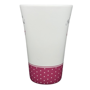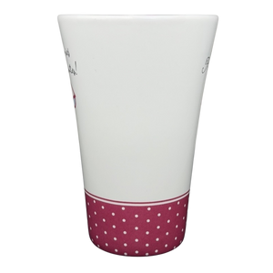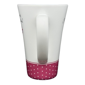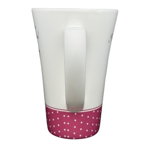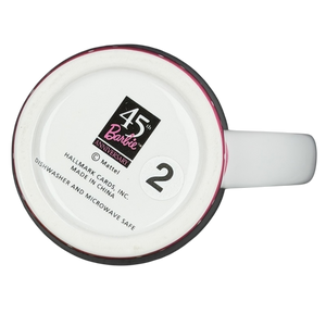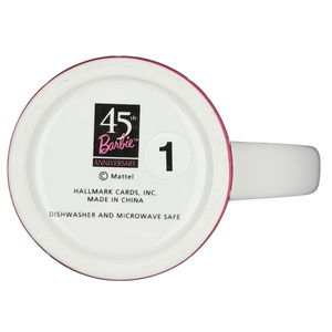 The flared shape offers a comfortable hold and a generous capacity, while the smooth curved handle provides an easy, secure grip. The bottom stamp confirms its authenticity as an official Hallmark Cards release for Barbie’s 45th Anniversary and notes that it is both dishwasher and microwave safe for everyday convenience. Whether enjoyed as a functional piece or displayed as part of a Barbie collection, this mug adds personality, charm, and a touch of fashion-forward flair to any space.