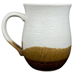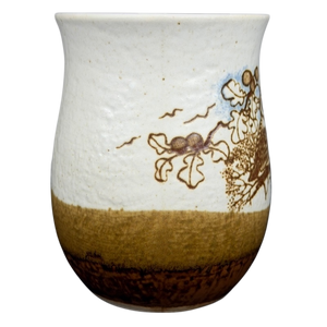 This vintage Otagiri mug features a charming woodland scene of two owls perched together on a branch, surrounded by softly sketched leaves and acorns in warm, earthy tones. The gently flared form is finished with a creamy speckled off-white upper glaze that transitions into a muted olive band and a richly textured dark brown base, giving the mug a rustic, nature-inspired feel. A comfortably curved handle complements the organic shape, while subtle glaze variations enhance its handcrafted character. A cozy, forest-themed mug that adds warmth and quiet charm to everyday coffee or tea moments.
