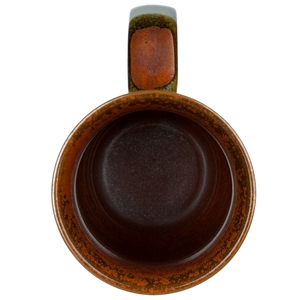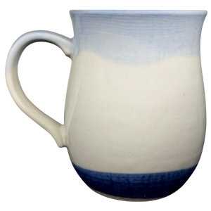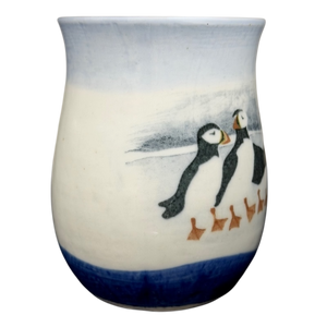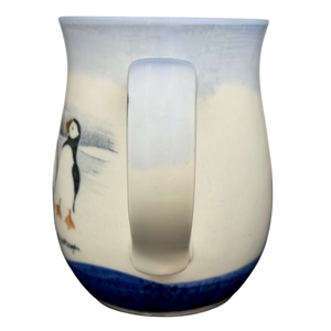 This vintage Otagiri stoneware mug features an endearing seaside scene of puffins standing together along a snowy shoreline, rendered in soft coastal tones that evoke a calm, wintry atmosphere. The gently flared form is finished with a creamy off-white body, a pale sky-blue wash near the rim, and a deep blue band at the base that grounds the design. A comfortably curved handle complements the smooth glaze transitions, while subtle variations add to its handcrafted character. The artwork is signed by the artist, W. Morgan, near the lower edge of the scene, adding a distinctive collectible detail to this charming, nature-inspired mug.