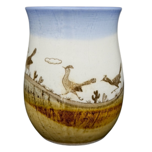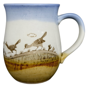 This vintage Otagiri stoneware mug features a playful desert scene of roadrunners darting across rolling hills dotted with cacti, illustrated in warm earth tones against a soft sky-blue horizon. The gently rounded form is finished with layered glazes, transitioning from a pale blue rim into a creamy midsection and a richly textured tan and rust base that echoes the arid landscape. A comfortably curved handle and subtle glaze variations enhance its handcrafted character, making it both functional and collectible. A charming Southwestern-inspired mug that brings a sense of motion and whimsy to everyday coffee or tea.