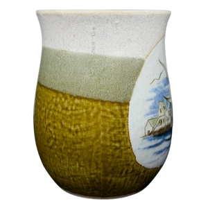 This vintage Otagiri stoneware mug features a charming harbor scene framed within an oval medallion, depicting sailboats at dock with seagulls gliding overhead across rippling blue water. The gently flared form is finished with a creamy off-white rim, a soft sage-green transition, and a richly textured golden-olive lower glaze that adds depth and warmth. A sturdy, comfortably curved handle mirrors the layered glazes, while subtle surface variations throughout highlight its rustic, handcrafted character. A timeless nautical-inspired mug that brings coastal charm to everyday coffee or tea.
