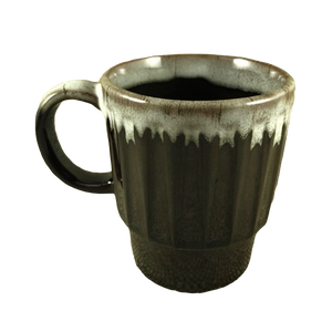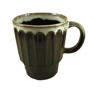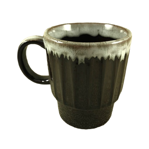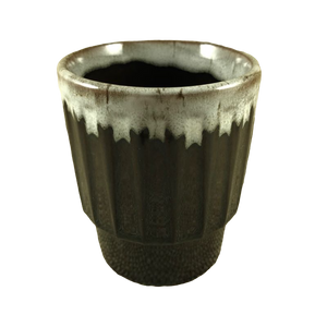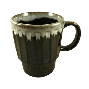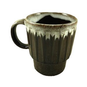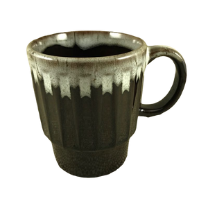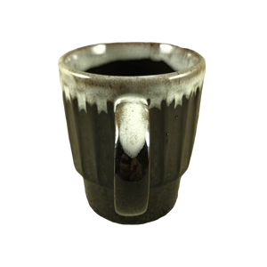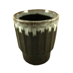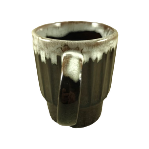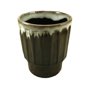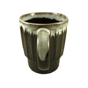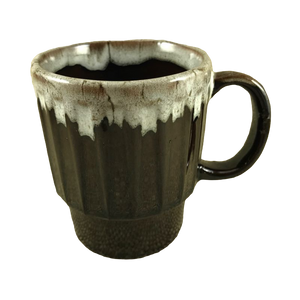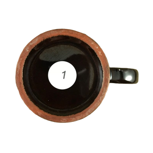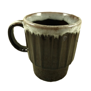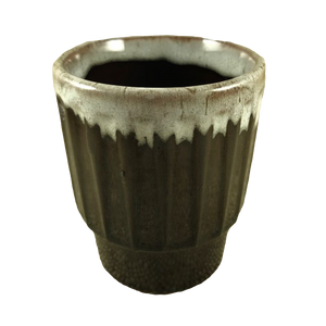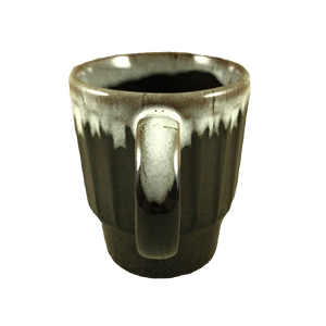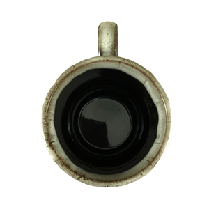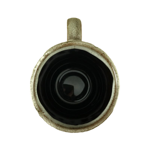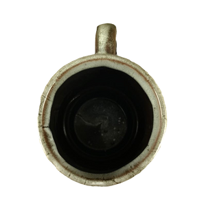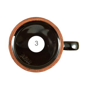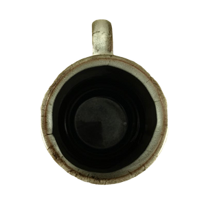 Vintage stacking mug with a two tone appearance on its exterior and interior surfaces. It's a lighter beige shade on the top 1/4 and darker brown on the lower 3/4.