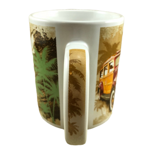 Features artwork wrapping around its exterior surface and on the handle relating to surfing.