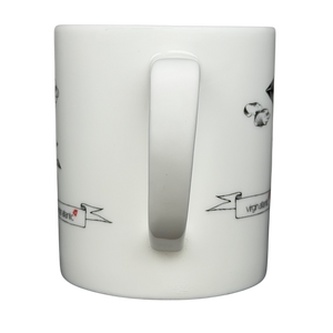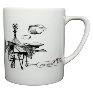 This minimalist white ceramic mug features whimsical black line illustrations of early flying machines and airships designed by Robert Welch, accented with small banner details reading “Virgin Atlantic” for a playful nod to aviation history. The artwork wraps around the mug in a clean, airy layout that reflects Welch’s distinctive balance of precision and imagination, while the classic cylindrical shape and comfortable handle make it ideal for everyday use. Marked as a Limited Edition Container Plus piece, this mug blends thoughtful design with subtle branding, making it an appealing collectible for aviation enthusiasts and fans of Robert Welch’s iconic design work.