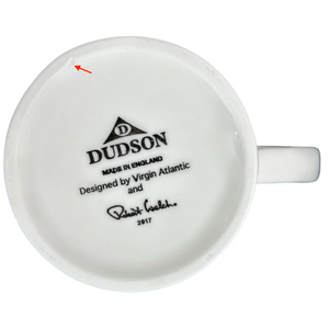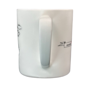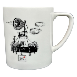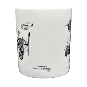This minimalist white ceramic mug features finely detailed black line illustrations of imaginative early flying machines and airships, designed by Robert Welch and accented with small “Virgin Atlantic” banner details that add a playful aviation theme. The artwork wraps cleanly around the mug with generous white space, highlighting Welch’s precise, technical drawing style and sense of visual storytelling. Finished with a classic cylindrical form, comfortable handle, and marked as a Limited Edition Container Plus piece, this mug offers understated elegance and collectible appeal for fans of aviation design, modern British aesthetics, and Robert Welch’s iconic work.